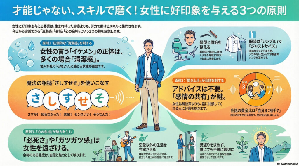 先ほどお伝えした内容をさらに具体化し、今日から実践できる**「女性に好感を持たれるためのロードマップ」**として整理しました。