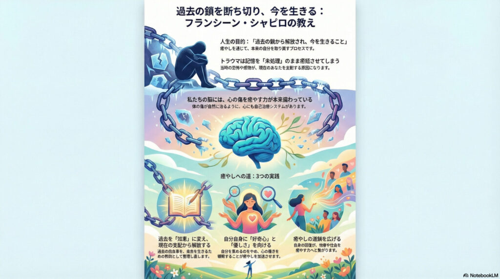 - 今、この瞬間を自由に生きること:過去の未処理な記憶を整理し、過去の亡霊に今日の決断を委ねないこと。