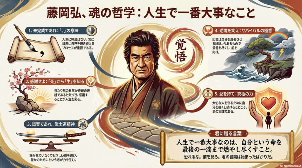私がこれまでの人生、そして世界中を駆け巡り、死線を幾度も越えてきた経験から、魂を込めてお伝えしたい。私、藤岡弘、が考える、人生で最も大切にすべきこと。それは……「愛と勇気を持って、今この瞬間を真剣に生き抜くという『覚悟』」だ。
