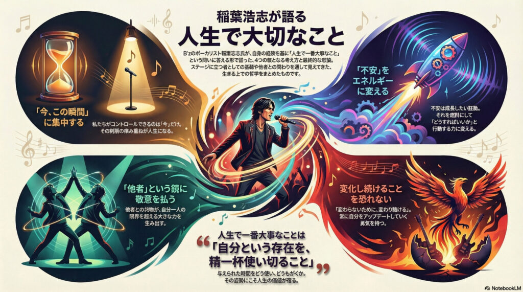 B’zもソロも、常に「新しい何か」を探しています。昔の成功体験にすがって、同じことだけを繰り返していると、心はどんどん錆びついてしまいます。新しい音楽、新しいトレーニング方法、新しい価値観。そうしたものに触れて、自分をアップデートしていくことは、とても刺激的で、同時に勇気がいることです。