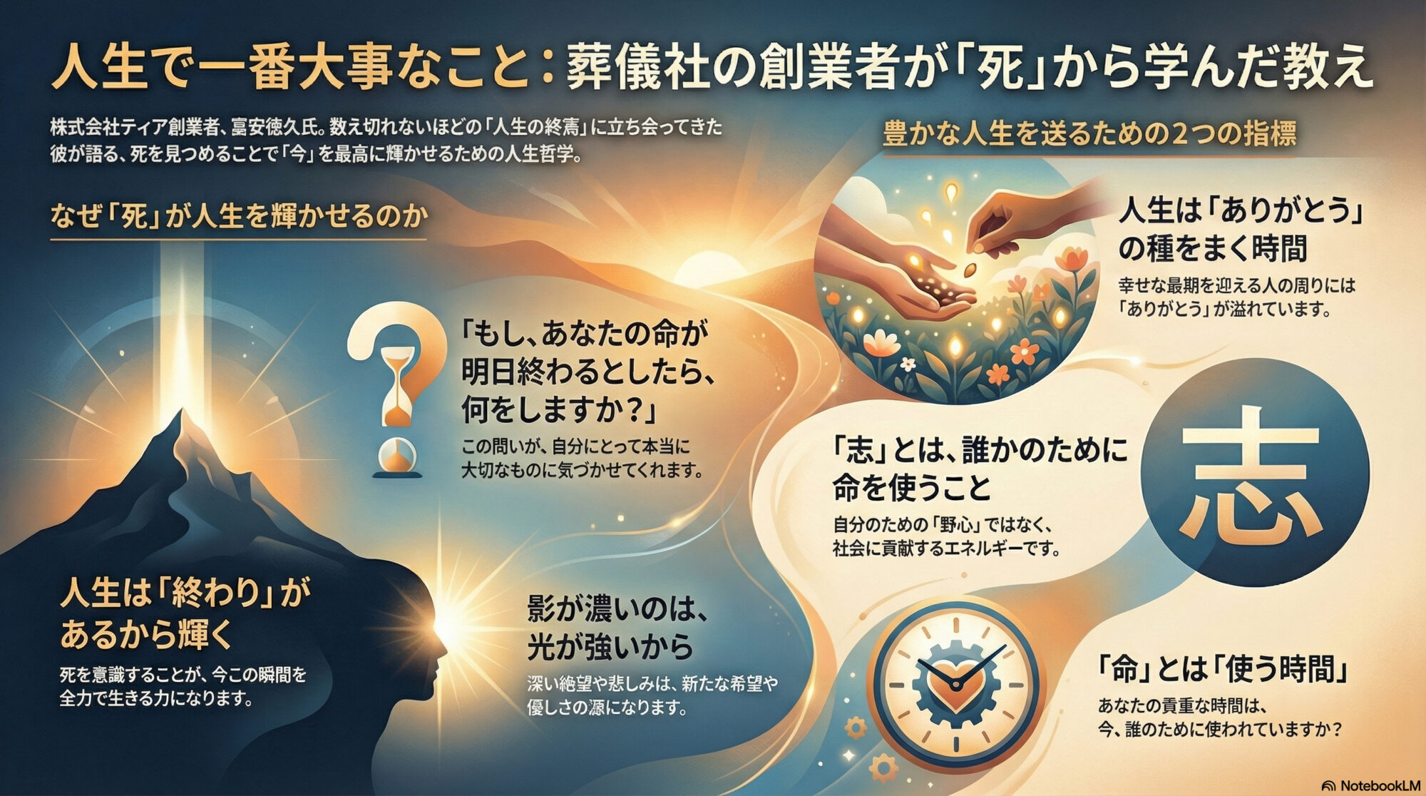 こんにちは、冨安徳久です。 「人生で一番大事なことは何か」という、この本質的な問いを投げかけていただ…